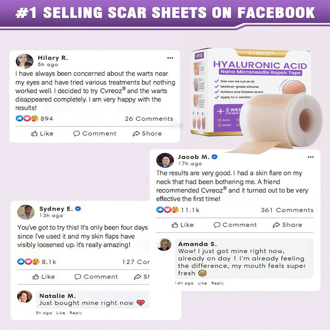 Formulated with medical-grade silicone and nano soluble microneedle technology, CVREOZ® Repair Tape helps soften, flatten, and fade scars naturally. Its unique formula is designed to visibly reduce the appearance of both new and old scars, including surgical scars, stretch marks, keloids, acne scars, burns, warts, skin tags, and varicose veins.